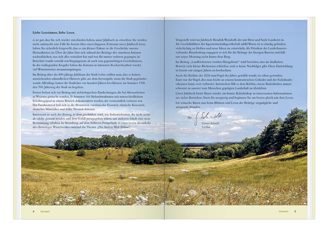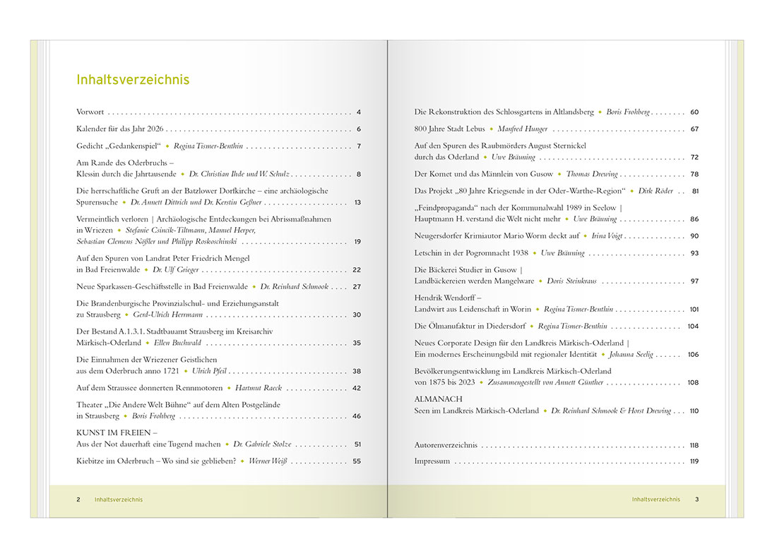 Der Landkreis Märkisch-Oderland legt die 33. Ausgabe seines Jahrbuchs vor. Auch für 2026 haben engagierte ehrenamtliche Autorinnen und Autoren vielfältige Beiträge zusammengestellt. Das Jahrbuch bietet erneut eine gelungene Mischung aus Vergangenheit und Gegenwart: Historische Rückblicke, aktuelle Entwicklungen und persönliche Porträts zeichnen ein lebendiges Bild des Landkreises. Freuen Sie sich auf eine anregende Lektüre – informativ, unterhaltsam und nah an der Region.
